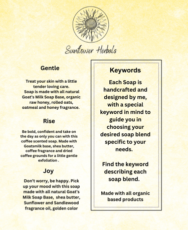 All soap blends are designed with a unique keyword to accompany it. These keywords are intuitively selected to bring you the the ultimate experience of a bath and body care product.